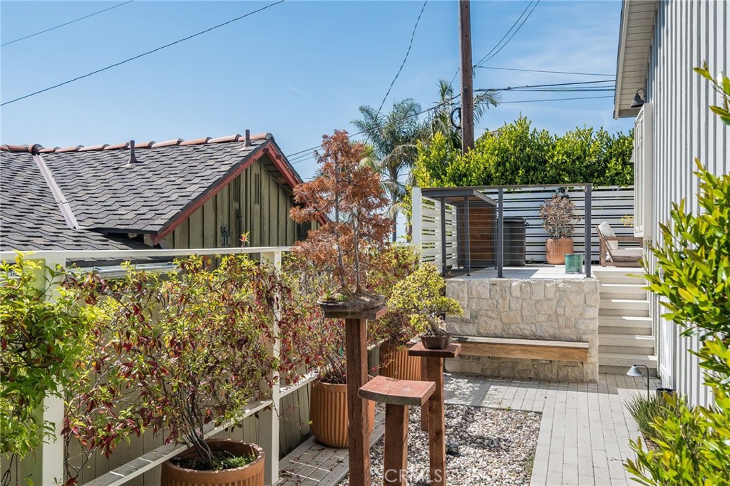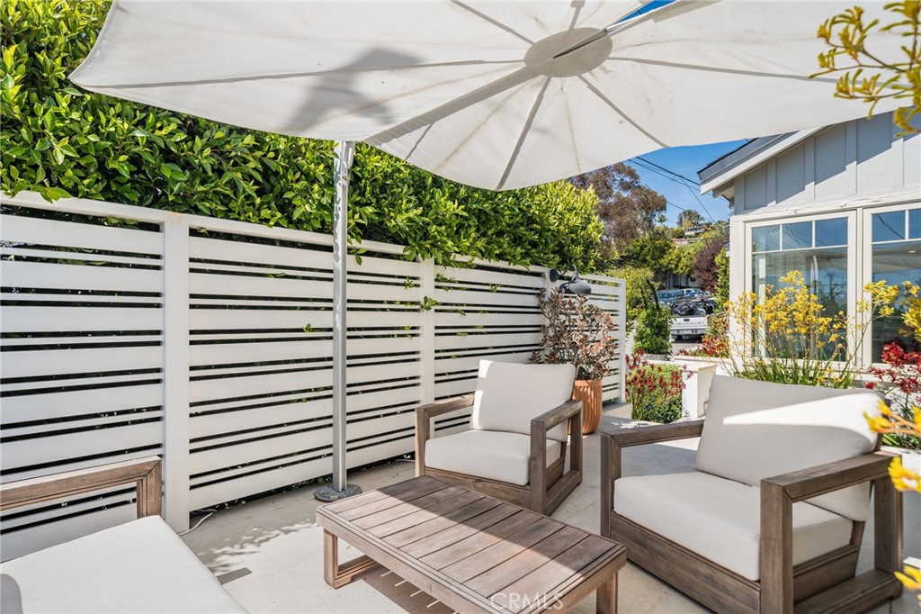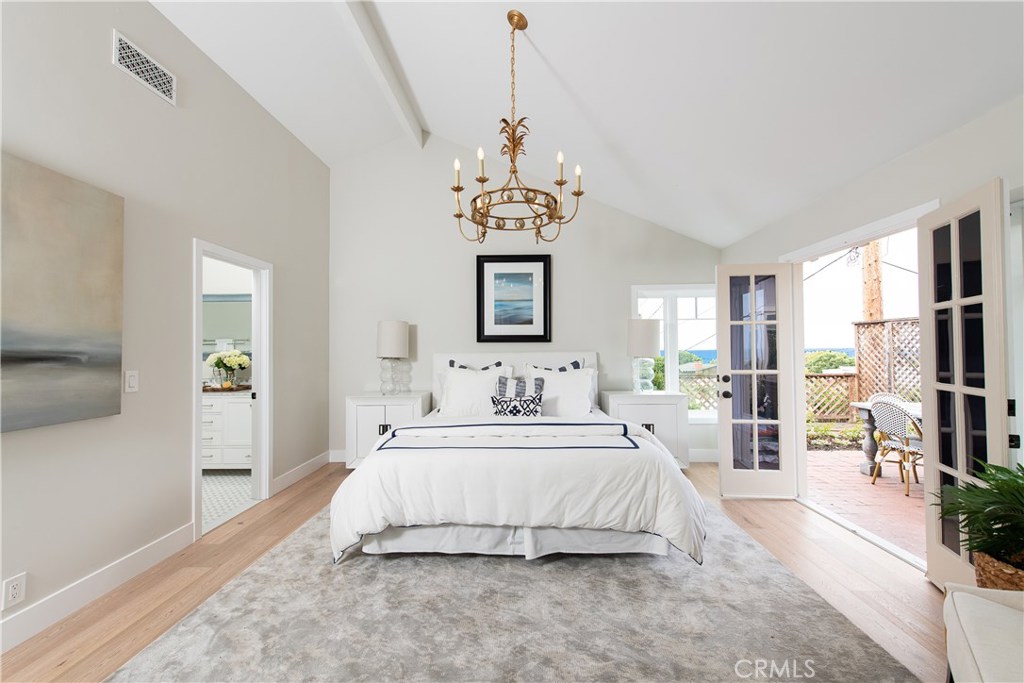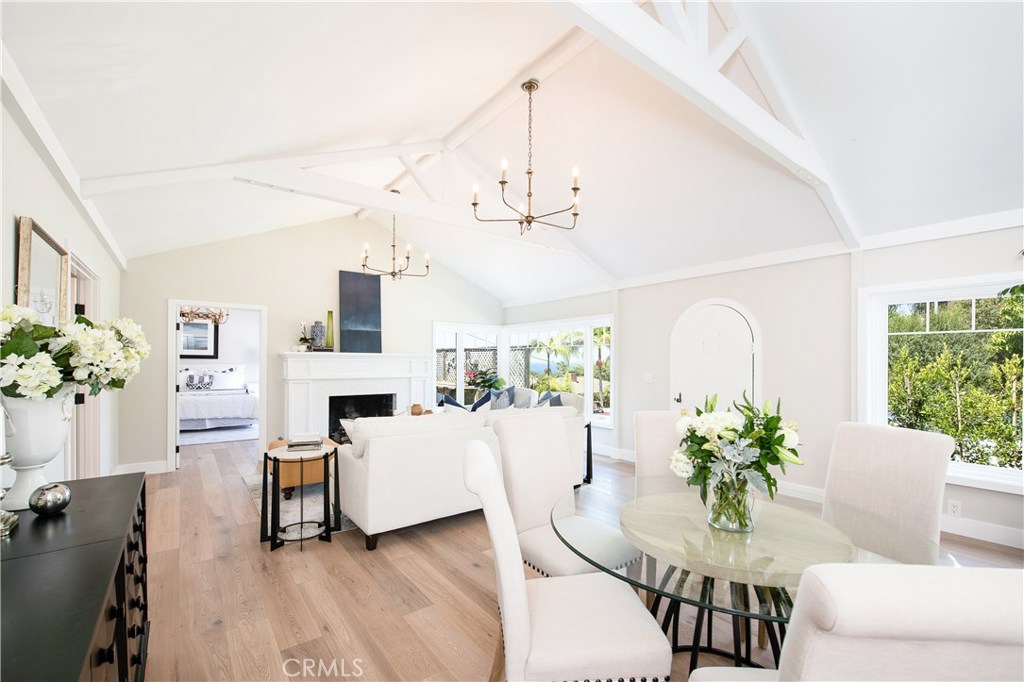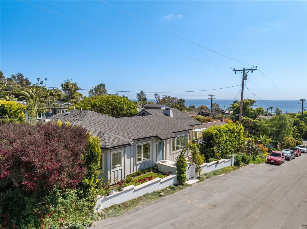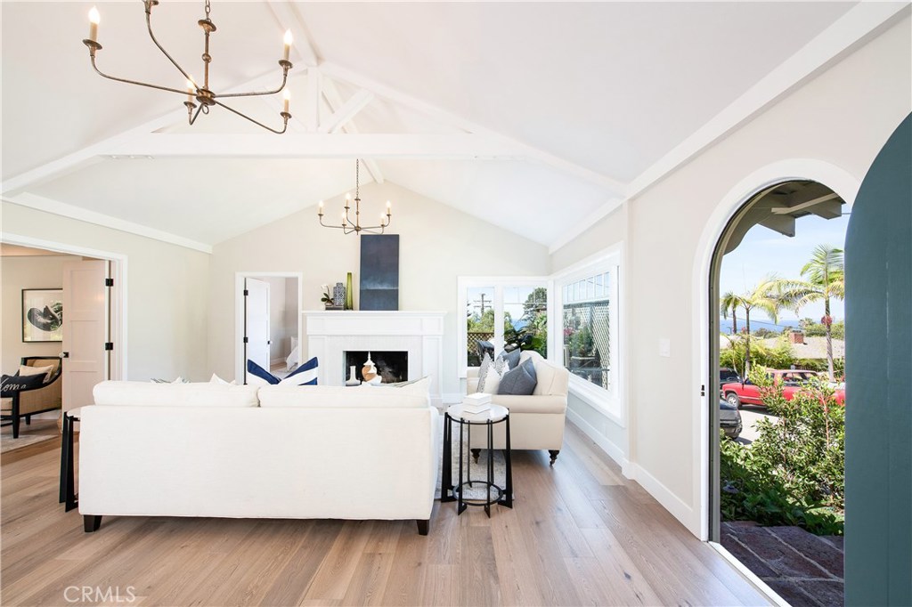 Nestled on a peaceful street in the coveted enclave of Woods Cove, 567 Flora is a beautifully reimagined four-bedroom residence that creates an environment of modern sophistication with timeless charm. Meticulously renovated with uncommon design elements and exceptional craftsmanship, this single-level home offers a rare and thoughtful floor plan, with all bedrooms conveniently situated on one level. From the moment you step inside, natural light pours through large windows, illuminating high vaulted ceilings and showcasing curated architectural details throughout. The main living area is anchored by a striking fireplace and expansive picture windows showing ocean views, creating a serene and elegant backdrop for everyday living. The primary suite is a private sanctuary, featuring a luxurious spa-inspired bath with a generous walk-in shower, an oversized soaking tub, and a spacious walk-in closet. French doors open to a charming, secluded patio--perfect for enjoying morning coffee while taking in the glimmer of the Pacific beyond. Each bedroom in the home enjoys direct outdoor access, from a shared deck between two rooms to a quiet side terrace adjacent to the office, offering the quintessential California indoor-outdoor lifestyle. At the heart of the home, the stunning chef's kitchen boasts high-end appliances, custom-milled cabinetry, and pristine Calacatta marble countertops and backsplash. An oversized eat-in island invites gatherings both intimate and grand. Throughout the interior, clean shiplap detailing lends a fresh, coastal-chic aesthetic that is both relaxed and refined. Even the garage has been thoughtfully considered--with sleek new epoxy flooring and a full bath, it offers the flexibility for use as a studio, gym, or creative space. Sitting on a quiet street, the birds chirp softly and the wind flows gently at 567 Flora.