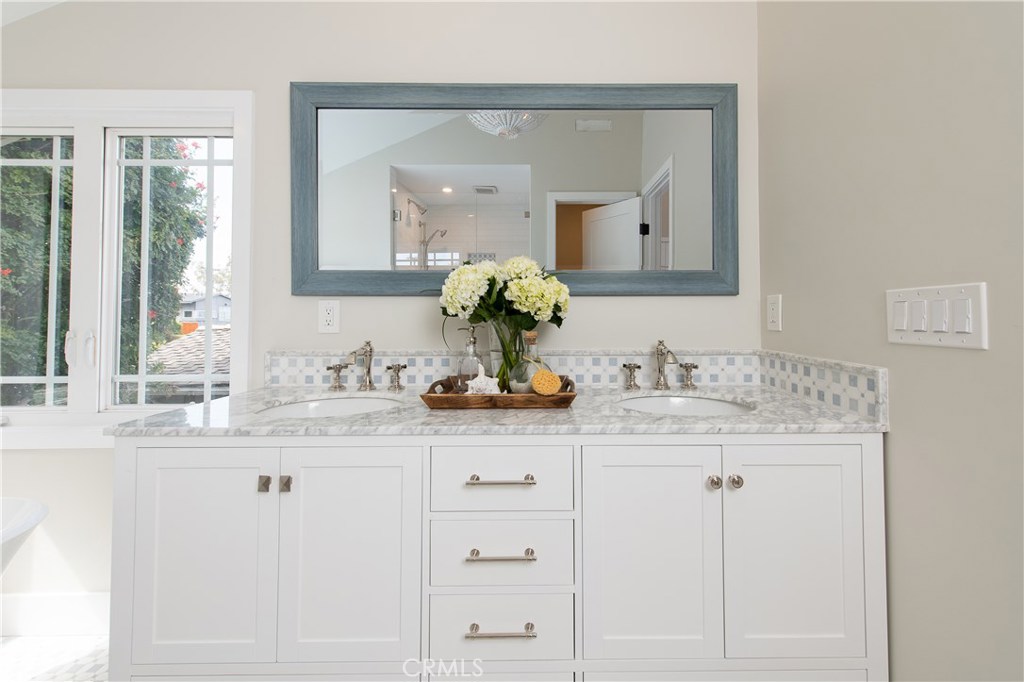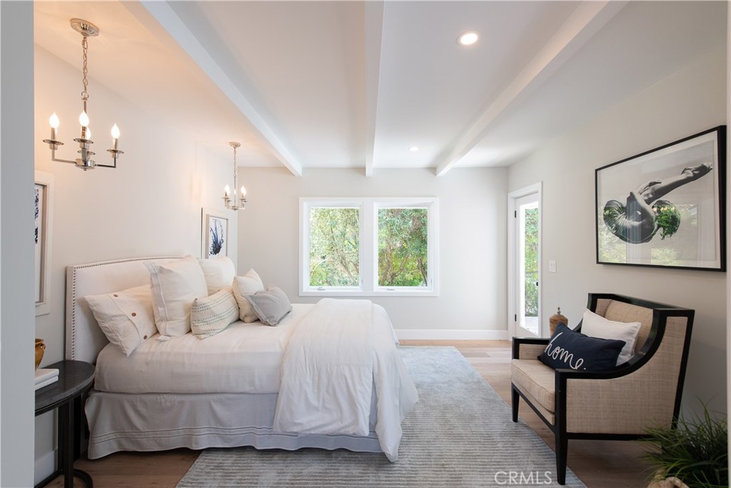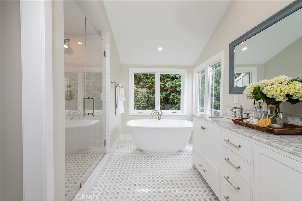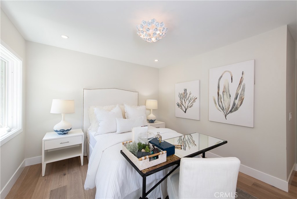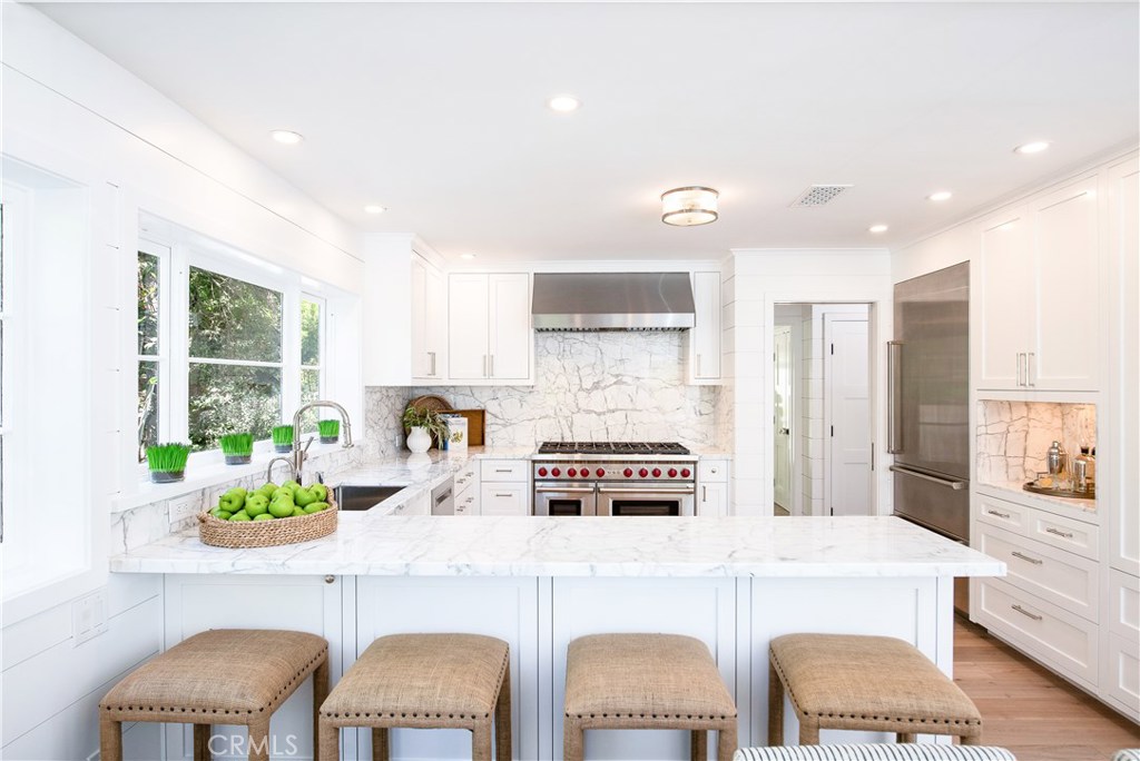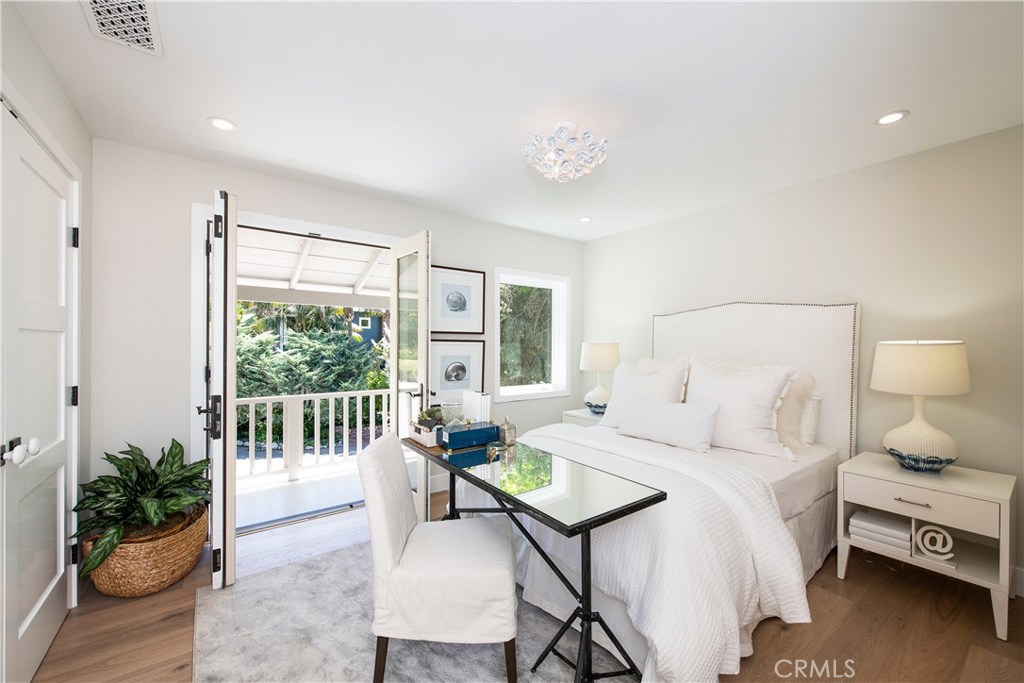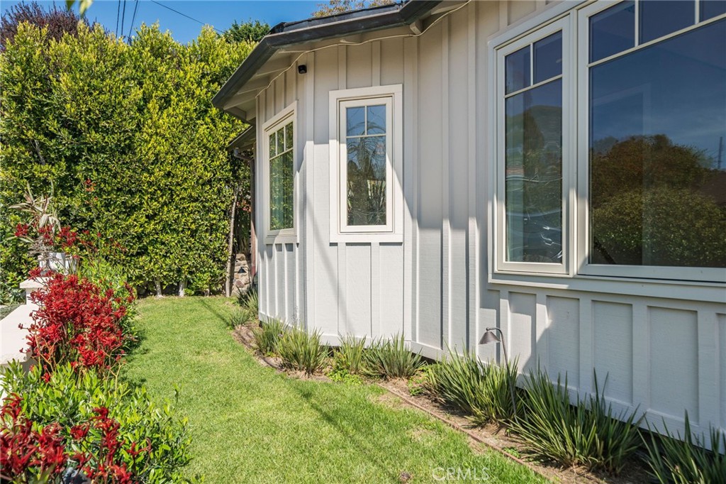 Nestled on a peaceful street in the coveted enclave of Woods Cove, 567 Flora is a beautifully reimagined four-bedroom residence that creates an environment of modern sophistication with timeless charm. Meticulously renovated with uncommon design elements and exceptional craftsmanship, this single-level home offers a rare and thoughtful floor plan, with all bedrooms conveniently situated on one level. From the moment you step inside, natural light pours through large windows, illuminating high vaulted ceilings and showcasing curated architectural details throughout. The main living area is anchored by a striking fireplace and expansive picture windows showing ocean views, creating a serene and elegant backdrop for everyday living. The primary suite is a private sanctuary, featuring a luxurious spa-inspired bath with a generous walk-in shower, an oversized soaking tub, and a spacious walk-in closet. French doors open to a charming, secluded patio--perfect for enjoying morning coffee while taking in the glimmer of the Pacific beyond. Each bedroom in the home enjoys direct outdoor access, from a shared deck between two rooms to a quiet side terrace adjacent to the office, offering the quintessential California indoor-outdoor lifestyle. At the heart of the home, the stunning chef's kitchen boasts high-end appliances, custom-milled cabinetry, and pristine Calacatta marble countertops and backsplash. An oversized eat-in island invites gatherings both intimate and grand. Throughout the interior, clean shiplap detailing lends a fresh, coastal-chic aesthetic that is both relaxed and refined. Even the garage has been thoughtfully considered--with sleek new epoxy flooring and a full bath, it offers the flexibility for use as a studio, gym, or creative space. Sitting on a quiet street, the birds chirp softly and the wind flows gently at 567 Flora.